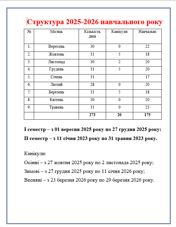 З урахуванням місцевих особливостей та кліматичних умов за погодженням з відповідними місцевими органами управління освітою можуть змінюватися структура навчального року та графік учнівських канікул.
